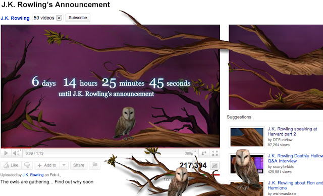 Fans have been up in arms trying to find out what the J.K. Rowling site, Pottermore.com is and what it will entail. Well, today, the fans find out they only have to wait a bit longer. J.K. Rowling's YouTube page has been revamped and now looks like this....